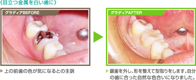 虫歯治療で入れた金属の詰め物を目立たない白や金の詰め物に変える治療法です。大きく口を開けて笑っても、何処を治療したのか分からなくなります。当院では天然歯と同じように見えるセラミックやグラディア、ご希望によりゴールドで治療いたします。
